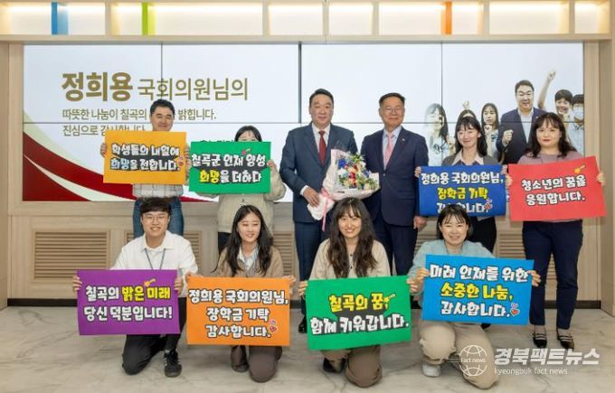 경북팩트뉴스 조현묵 기자 | 정희용 국회의원이 고령군과 성주군에 이어 칠곡군에까지 지역 인재 육성을 위한 장학금을 기탁하며 지역 교육 발전에 대한 지속적인 지원을 이어가고 있다.