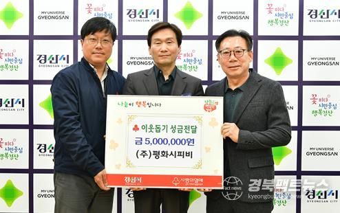 경북팩트뉴스 조현묵 기자 | 경산시 남산면에 위치한 ㈜평화시피비는 28일 경산시청을 방문해 소외된 이웃을 위한 성금 500만원을 기탁했다.
