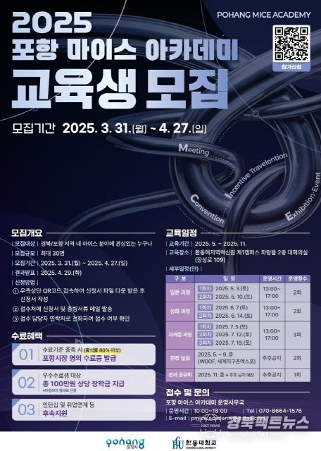 경북팩트뉴스 남유신 기자 | 포항시는 지역 내 마이스(MICE) 산업의 전문 인재를 양성하기 위해 ‘2025 포항 마이스 아카데미’ 교육생을 모집한다.