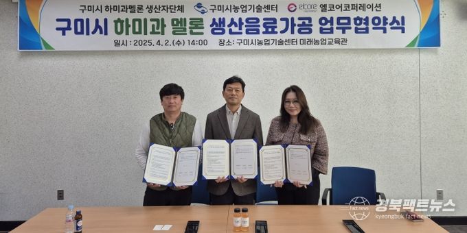 경북팩트뉴스 조현묵 기자 | 구미시는 지난 2일 농업기술센터 미래농업교육관에서 하미과멜론생산자단체, ㈜엘코어코퍼레이션과 하미과 멜론의 생산 및 음료 가공을 위한 업무협약을 체결했다.