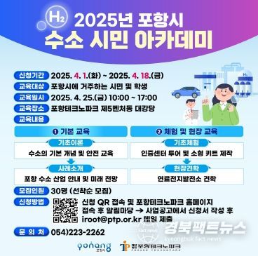 경북팩트뉴스 남유신 기자 | 포항시와 포항테크노파크는 시민들의 수소에너지에 대한 이해도를 높이고 친환경 에너지 전환을 촉진하기 위한 ‘2025 포항 수소 시민 아카데미’의 교육생을 모집한다.