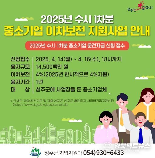 신청기간은 4월 14일부터 16일까지이며, 경상북도 중소기업 육성자금 지펀드에서 온라인으로 신청하거나, 성주군청 기업지원과로 방문하여 신청하면 된다.