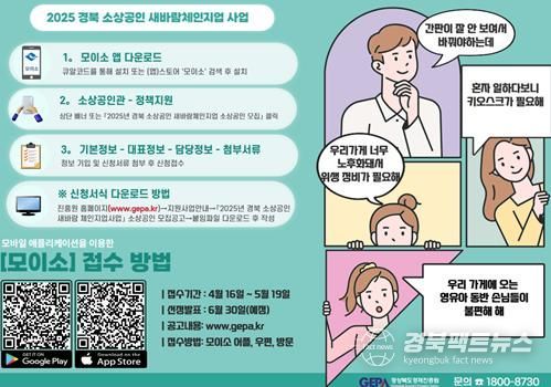 신청은 5월 19일까지 ‘모이소’ 앱, 우편 또는 방문 접수를 통해 가능하며, 자세한 사항은 경산시청 홈페이지 또는 경상북도경제진흥원을 통해 확인할 수 있다.