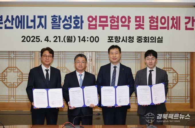 경북팩트뉴스 남유신 기자 | 포항시는 21일 GS건설, HD현대인프라코어, 아모지(AMOGY)와 함께 ‘포항 분산에너지 활성화’를 위한 업무협약을 체결했다.