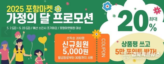 경북팩트뉴스 남유신 기자 | 포항시는 가정의 달 5월을 맞아 지역 농특산물 소비 촉진을 위해 포항시 온라인 쇼핑몰 ‘포항마켓’에서 5월 2일부터 23일까지 22일간 특별 할인 프로모션을 실시한다.