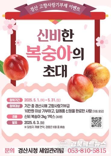 경북팩트뉴스 조현묵 기자 | 경산시는 5월 가정의 달을 맞이하여 경산 고향사랑기부 '신비한 복숭아의 초대'이벤트를 실시한다고 밝혔다.