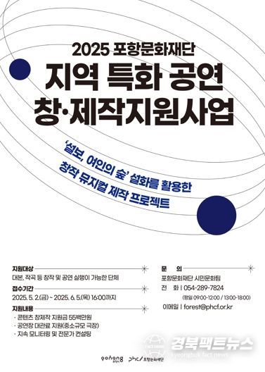 경북팩트뉴스 이경원 기자 | 포항문화재단은 포항 지역 설화를 기반으로 한 창작 뮤지컬을 발굴하기 위해 ‘2025 지역 특화 공연 창·제작지원사업’의 공모를 실시하고 내달 5일까지 접수한다.