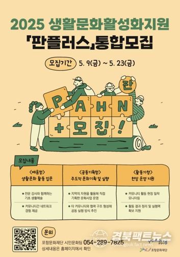 경북팩트뉴스 이경원 기자 | 포항문화재단은 ‘2025 포항생활문화 활성화 지원 판플러스 사업’의 통합공모를 오는 23일까지 진행한다.
