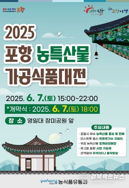 경북팩트뉴스 남유신 기자 | 포항시는 오는 6월 7일 오후 3시부터 10시까지 영일대 장미공원 앞 광장에서 ‘2025 포항시 농특산물 가공식품대전’을 개최한다.