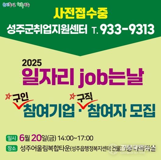 경북팩트뉴스 조현묵 기자 | 성주군이 오는 20일 성주어울림복합센터 에서 개최하는 '2025년 1차 일자리 job는날 구인구직 채용행사' 참가기업과 참여자를 사전 모집한다.