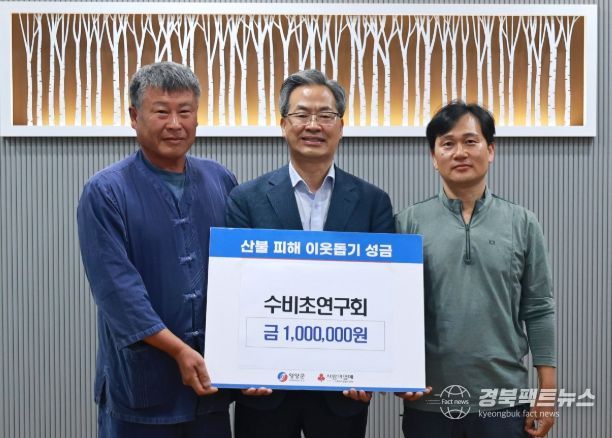 경북팩트뉴스 조현묵 기자 | 영양 수비초연구회(회장 정구식)는 6월 11일, 경북 영양군 산불 피해 농가의 복구 지원을 위해 성금 100만 원을 기부했다.