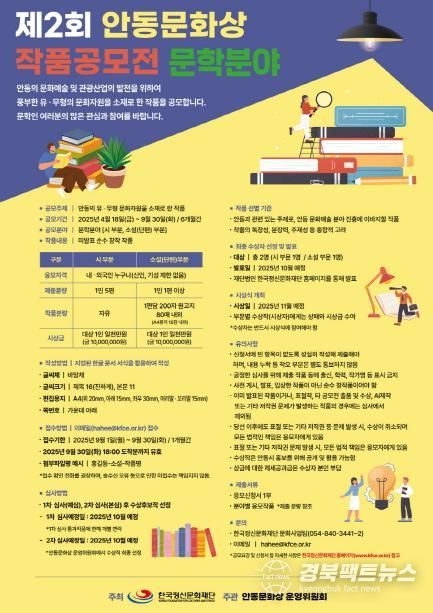 제2회 안동문화상 박덕규 운영위원장은 “이번 작품공모전은 안동의 고유한 정신문화와 역사적 자산을 새로운 예술 언어로 재창조할 기회”라며 “국내외 예술가들이 안동을 소재로 한 창의적이고 품격 있는 작품을 통해 지역문화의 깊이를 널리 알리는 계기가 되길 기대한다”고 밝혔다.