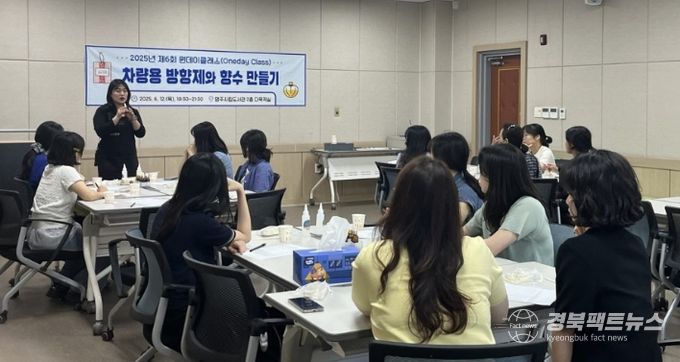 경북팩트뉴스 조현묵 기자 | 영주시 평생학습센터는 지난 6월 12일 영주시립도서관 2층 다목적실에서 제6회 원데이클래스 ‘차량용 방향제와 향수 만들기’ 체험 강좌를 진행했다.