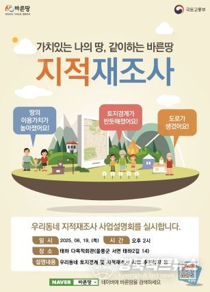 경북팩트뉴스 조현묵 기자 | 울릉군은 6월 19일서면 태하 다목적회관(서면 태하2길 14)에서 2025년 태하2지구 지적재조사사업 주민설명회’를 개최한다고 밝혔다.