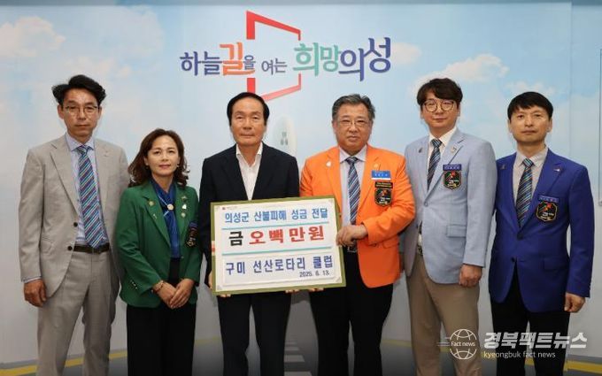 김주수 의성군수는 “어려운 시기에 따뜻한 마음으로 도움을 주신 구미 선산로타리클럽에 깊이 감사드린다”며 “기탁해주신 성금은 피해 주민들에게 큰 위로가 될 것이며, 소중한 뜻이 잘 전달되도록 하겠다”고 전했다.