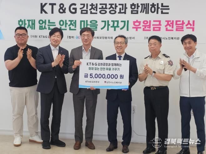 KT&G 김천공장은 지역사회 복지 증진을 위해 지난 5월에도 4곳의 복지기관․시설에 각 5백만 원씩 총 2,000만 원의 후원금을 전달했으며, 이번 후원금은 김천시노인복지관과 김천재가노인통합지원센터에 △소방 사각지대 농촌마을 단독경보형 감지기 및 분말소화기 지원 △관내 노인 대상 건강관리 용품 세트 지원에 사용될 예정이다.