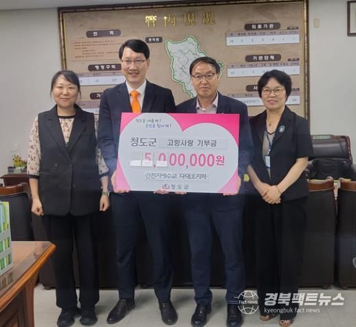 경북팩트뉴스 조현묵 기자 | 청도군 풍각면에서는 지난 18일 지역사회를 위한 따뜻한 고향사랑 기부가 이어지고 있으며, 신천지예수교 다대오지파 교인 일동은 고향사랑기부금 500만원을 기탁했다.