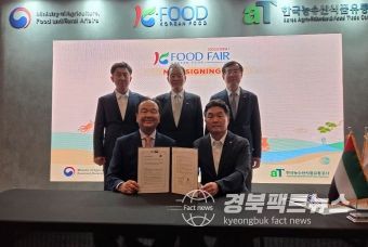 경북팩트뉴스 조현묵 기자 | 상주시 축산농협(조합장 김용준)은 6월 18일, 아랍에미리트(UAE) 두바이 주메이라비치 박람회장에서 열린 2025 K-FOOD FAIR에 참가해, 현지 프리미엄 한인 마트 1004GOURMET(대표 신동철)와 '명실상감한우 수출 업무협약(MOU)'을 체결했다고 밝혔다.