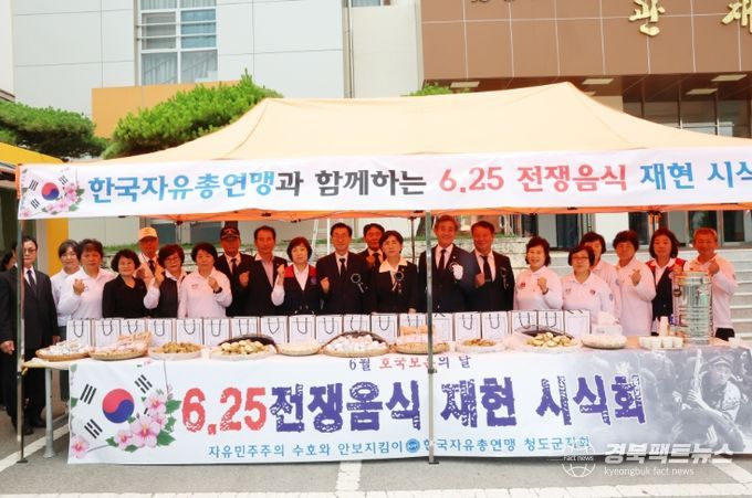 경북팩트뉴스 조현묵 기자 | 한국자유총연맹 청도군지회(회장 조인제)는 20일 모계중학교 일원에서 ‘호국보훈의 달’을 맞아 회원 20명과 김동기 청도 부군수와 전종율 청도군의회 의장, 이선희 경상북도의회 기획경제위원장을 비롯한 지역 주요 인사들이 참석한 가운데 6.25 전쟁 음식 체험 시식회를 열었다.