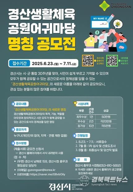 경북팩트뉴스 조현묵 기자 | 경산시가 시민과의 소통을 강화하고 공간의 정체성을 새롭게 정립하기 위해 ‘경산생활체육공원어귀마당’의 새로운 이름을 찾는 명칭 공모전을 개최한다.
