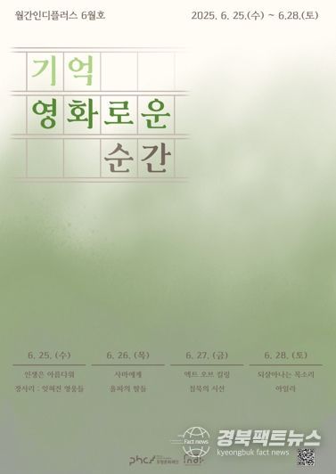 경북팩트뉴스 남유신 기자 | 포항문화재단이 운영하는 독립영화전용관 인디플러스 포항은 호국보훈의 달을 맞아 오는 25일부터 28일까지 4일간 ‘월간 인디플러스 6월호’ 기획전 ‘기억 영화로운 순간’을 개최한다.