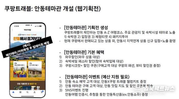 경북팩트뉴스 조현묵 기자 | 안동시는 쿠팡 트래블과 협업으로 안동여행 상품 판매와 홍보 및 관광 활성화를 위해 쿠팡 플랫폼 내'안동 테마관'을 개설 운영한다.