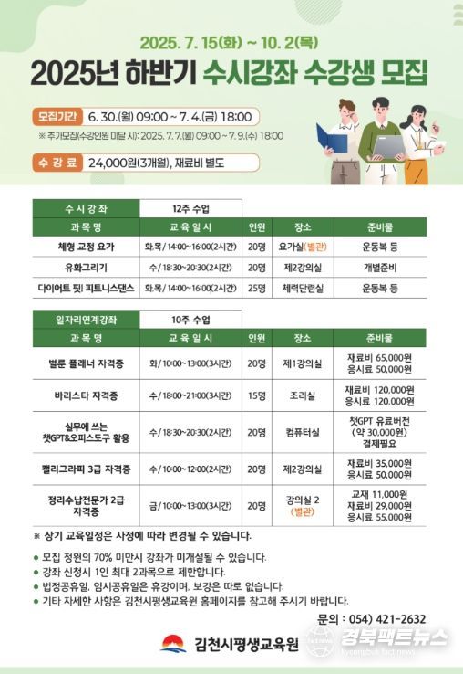 경북팩트뉴스 조현묵 기자 | 김천시평생교육원은 2025년 하반기 수시강좌 수강생을 오는 6월 30일부터 7월 4일까지 선착순으로 모집한다고 밝혔다.