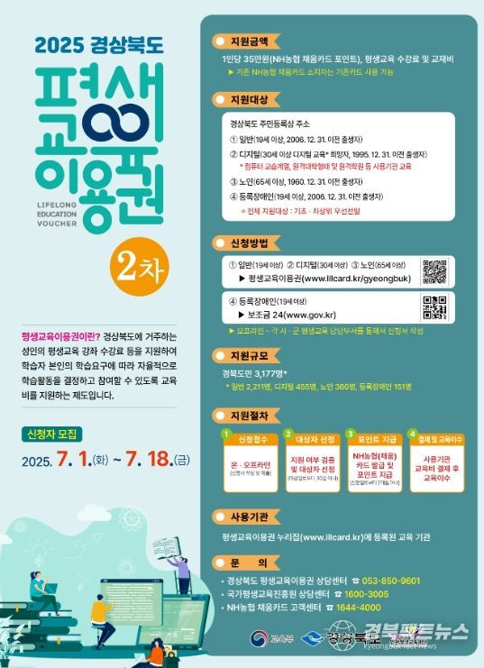 평생교육이용권은 경북도민의 평생학습 참여 확대와 자아실현을 지원하기 위해 추진되는 사업으로, 선정된 대상자에게는 NH농협채움카드를 통해 1인당 35만 원 상당의 포인트가 지급된다.