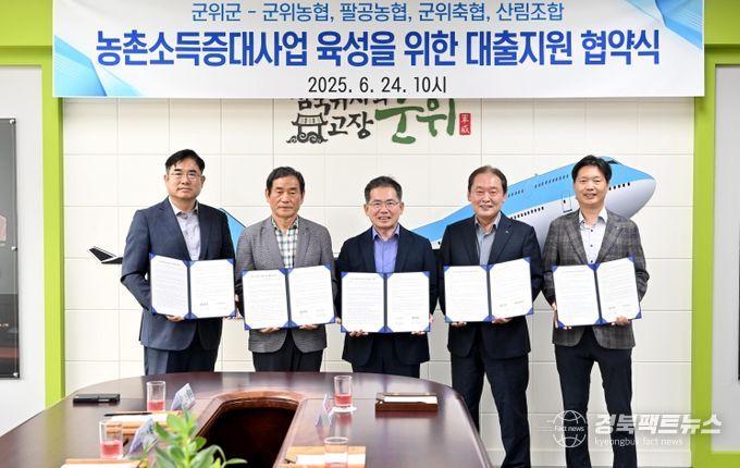 경북팩트뉴스 조현묵 기자 | 군위군은 6월 24일 군청 제1회의실에서 ‘농촌소득증대사업 육성 대출지원 협약’을 체결하고, 농업인의 경영안정을 위한 금융지원을 더욱 확대하기로 했다.