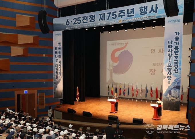 경북팩트뉴스 남유신 기자 | 포항시는 25일 시청 대잠홀에서 ‘6.25 전쟁 제75주년 행사’를 열고, 조국을 위해 헌신한 참전 유공자들의 숭고한 희생을 되새겼다.