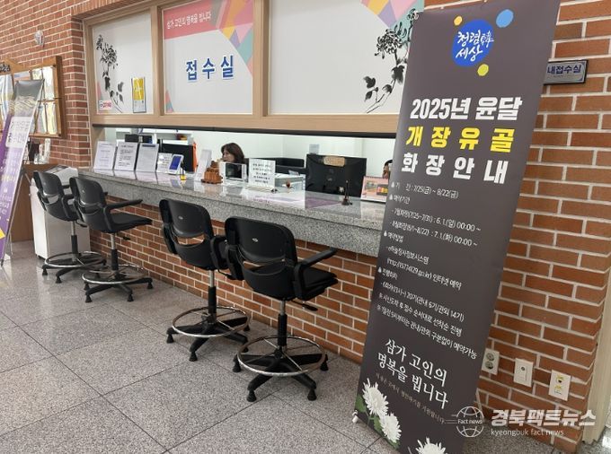 경북팩트뉴스 조현묵 기자 | 구미시추모공원은 2025년 윤달 기간에 개장유골 화장 수요가 대폭 늘어날 것에 대비하여 윤달 개장유골 회차 증설 계획을 수립한 후 예약접수를 진행하고 있다.
