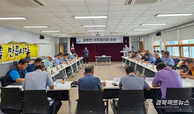이재수 감문면장은 “농번기로 바쁜 와중에도 시정에 대한 열의와 관심으로 회의에 참석해 주셔서 감사드린다.”라며, “이제 본격적인 장마철에 접어들어, 호우로 인한 수해와 산사태 발생 등 피해가 염려된다.”라며, 각 마을 이장님께서 각별히 신경 써 주시기를 부탁드린다.”라고 당부의 말을 전했다.