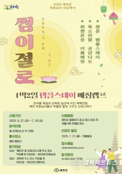 경북팩트뉴스 조현묵 기자 | 예천군은 6월 27일부터 7월 18일까지 1박2일 템플스테이 ‘썸이 절로’ 참가자를 모집한다.