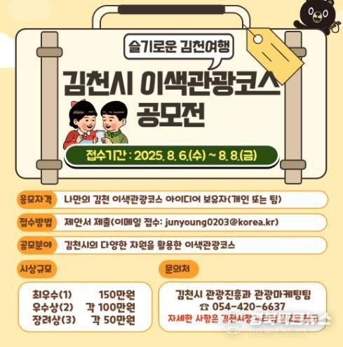 공모 주제는 ‘김천시의 관광 자원을 활용한 이색적인 관광코스’이며, 접수 기간은 8월 6일부터 8일까지 3일간이다.