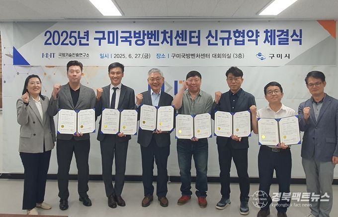 경북팩트뉴스 조현묵 기자 | 구미시 소재 국방기술진흥연구소 구미국방벤처센터는 지난 27일 구미국방벤처센터 회의실에서 중소·벤처기업 6개사와 방산 기술개발 및 경영 지원을 위한 신규 협약을 체결했다.