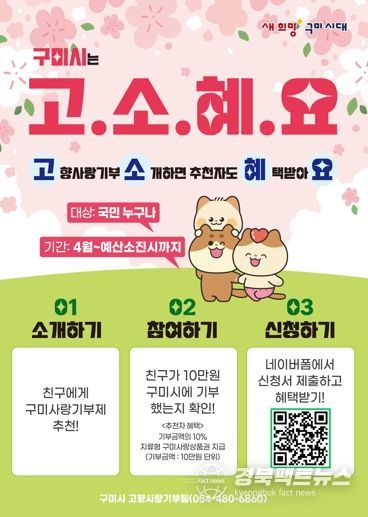 이번 방문은 고향사랑기부제의 안정적 정착을 위한 현장 중심의 홍보 활동의 일환으로, 제도 설명과 함께 자발적 기부를 독려하고 ‘구미시는 고소혜요’ 현장 이벤트도 병행했다. 재단 임직원들은 기부 참여는 물론 향후 지속적인 홍보 협조도 약속했다.