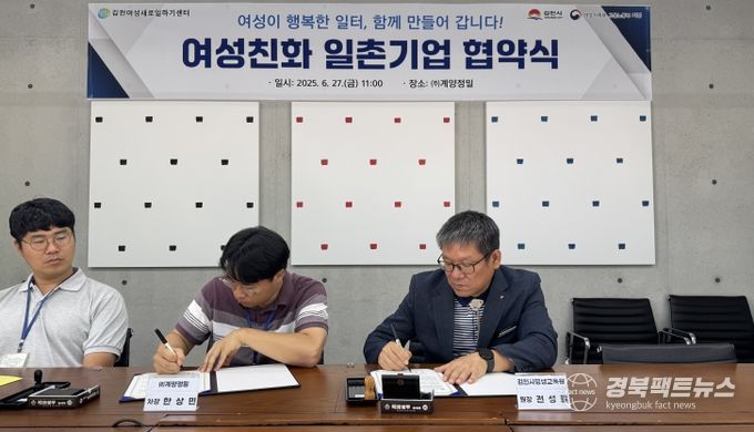 경북팩트뉴스 조현묵 기자 | 김천여성새로일하기센터는 지난 6월 27일 ㈜계양정밀에서 지역 여성의 취업 확대와 안정적인 고용 환경 조성을 위해 ‘여성 친화 일촌 기업 협약’을 체결했다.