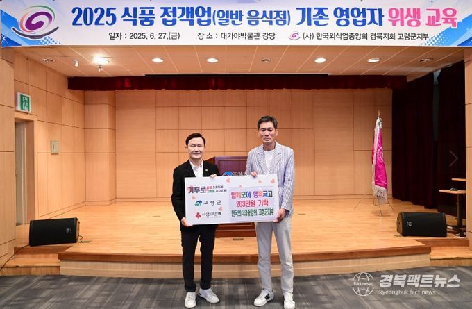 경북팩트뉴스 조현묵 기자 | 한국외식업중앙회 고령군지부에서는 6월 27일 대가야박물관 강당에서 개최된'한국외식업중앙회 고령군지부 2025년 위생교육'행사에서 ‘함께모아 행복금고’ 성금 203만원을 기탁했다.