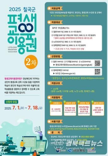 경북팩트뉴스 조현묵 기자 | 칠곡군은 7월 1일부터 7월 18일까지 ‘평생교육이용권’ 2차 지원자를 모집한다고 밝혔다.