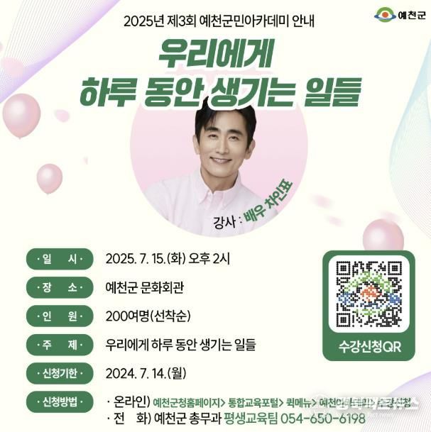 경북팩트뉴스 남유신 기자 | 예천군은 이달 15일 오후 2시, 예천군문화회관에서 ‘2025년 제3회 예천군민아카데미’를 개최한다.
