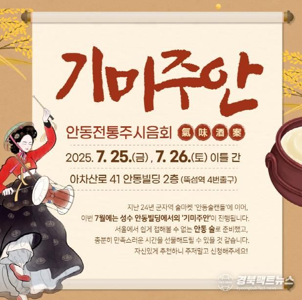 경북팩트뉴스 남유신 기자 | 안동시는 안동시관광협의회와 함께, 7월 25일부터 7월 26일까지 서울 성수동에서 안동 전통주를 체험할 수 있는 팝업스토어 ‘기미주안’을 운영한다.