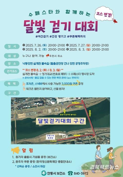 경북팩트뉴스 남유신 기자 | 안동시는 ‘2025 안동 수(水)페스타’ 연계 행사로 진행되는 ‘달빛걷기대회’의 코스를 8월부터 새롭게 변경한다고 밝혔다.