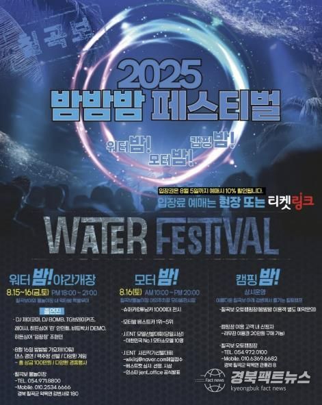 경북팩트뉴스 남유신 기자 | 아빠는 엔진 소리에 귀를 세우고, 엄마는 강변 바람에 몸을 맡기고, 아이는 물총을 움켜쥔다. 올여름 칠곡보야외물놀이장에서는 가족 모두가 취향대로 즐길 수 있는‘세 가지 밤’축제가 열린다.