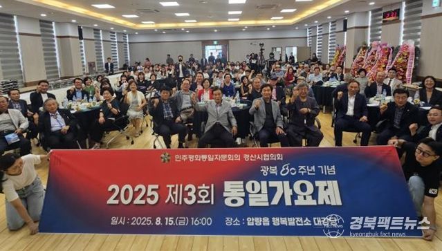 경북팩트뉴스 남유신 기자 | 광복 80주년을 맞아 남과 북이 음악으로 하나 되는 무대가 경산에서 열렸다. 민주평화통일자문회의 경산시협의회(협의회장 김형수)는 15일 경산시 압량읍 행복발전소에서 시민과 북한이탈주민 등 130여 명이 함께한 가운데‘남북밴드 리멤버 평화음악회’와‘제3회 통일가요제’를 성황리에 개최했다.
