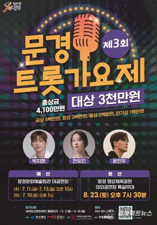 경북팩트뉴스 남유신 기자 | 문경시는 오는 8월 23일 오후 7시 30분, 영강체육공원 야외공연장 특설무대에서 ‘제3회 문경트롯가요제’ 본선을 성대하게 개최한다고 밝혔다.