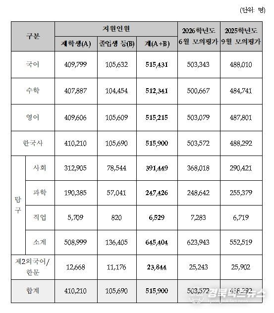 이번 9월 모의평가에 지원한 수험생은 515,900명으로, 재학생은 410,210명이고 졸업생 등 수험생은 105,690명이다.