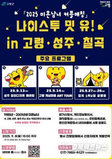 이번 행사는 고령군과 성주군, 칠곡군 3개 군이 합동으로 추진하는 행사로 1985년에서 2001년생의 미혼남녀가 대상이다. 신청은 오는 9. 8. 15시까지 네이버 폼 온라인으로 접수를 받으며 신청자들이 많을 경우 고령, 성주, 칠곡에 근무 또는 거주하는 신청자가 우선 선발이 된다.