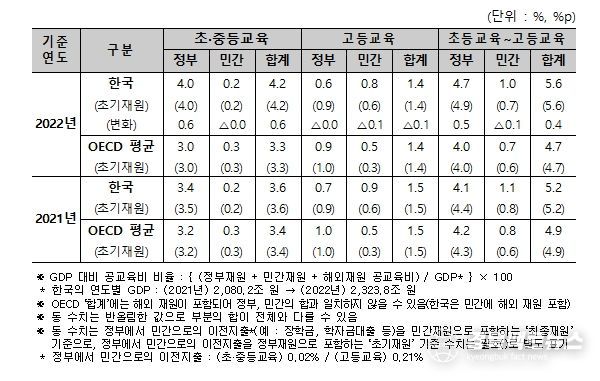 초·중등교육 단계 국내총생산(GDP) 대비 정부 재원 공교육비 비율은 4.0%로 2021년 대비 0.6%p 증가하여, 경제협력개발기구(OECD) 평균을 상회했다.