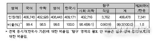 영어 영역의 경우, 사회탐구 영역 58.3%, 과학탐구 영역 22.4%이었으며, 사회탐구와 과학탐구 영역을 조합해 응시한 비율은 17.7%이었다.