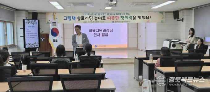 경북팩트뉴스 남유신 기자 | 경상북도영양교육지원청은 2025년 10월 14일 영양교육지원청 대회의실에서 ‘그림책 슬로리딩 놀이로 따뜻한 창의력을 키워요’라는 주제로 관내 유치원, 어린이집 및 초등 1, 2학년 학생과 학부모를 대상으로 2025 유치원·초등 저학년 보호자 및 책나눔 자원봉사자 연수를 개최했다.